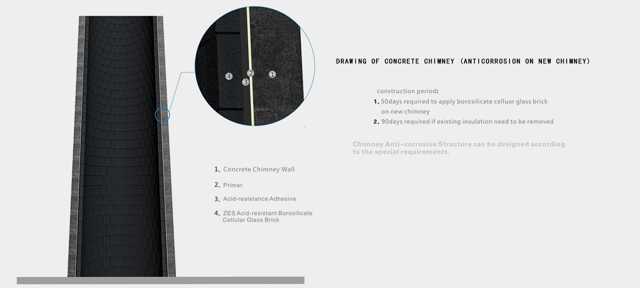 At chimney anticorrosion field, ZES brings professional one-stop services to our clients, including engineering design, foam glass selection guide, construction supervision and guidance, engineering acceptance, etc.