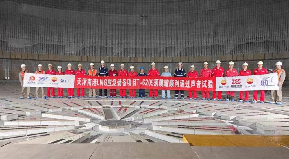 8月20日,天津南港LNG應(yīng)急儲備項目儲罐二階段進(jìn)行T-6205薄膜罐次屏蔽聲音試驗,經(jīng)過2個多小時的緊張檢查,經(jīng)總包單位、監(jiān)理、以及GTT等各方代表聯(lián)合確認(rèn),T-6205薄膜罐次屏蔽系統(tǒng)順利通過聲音試驗,取得第一個階段性成果。