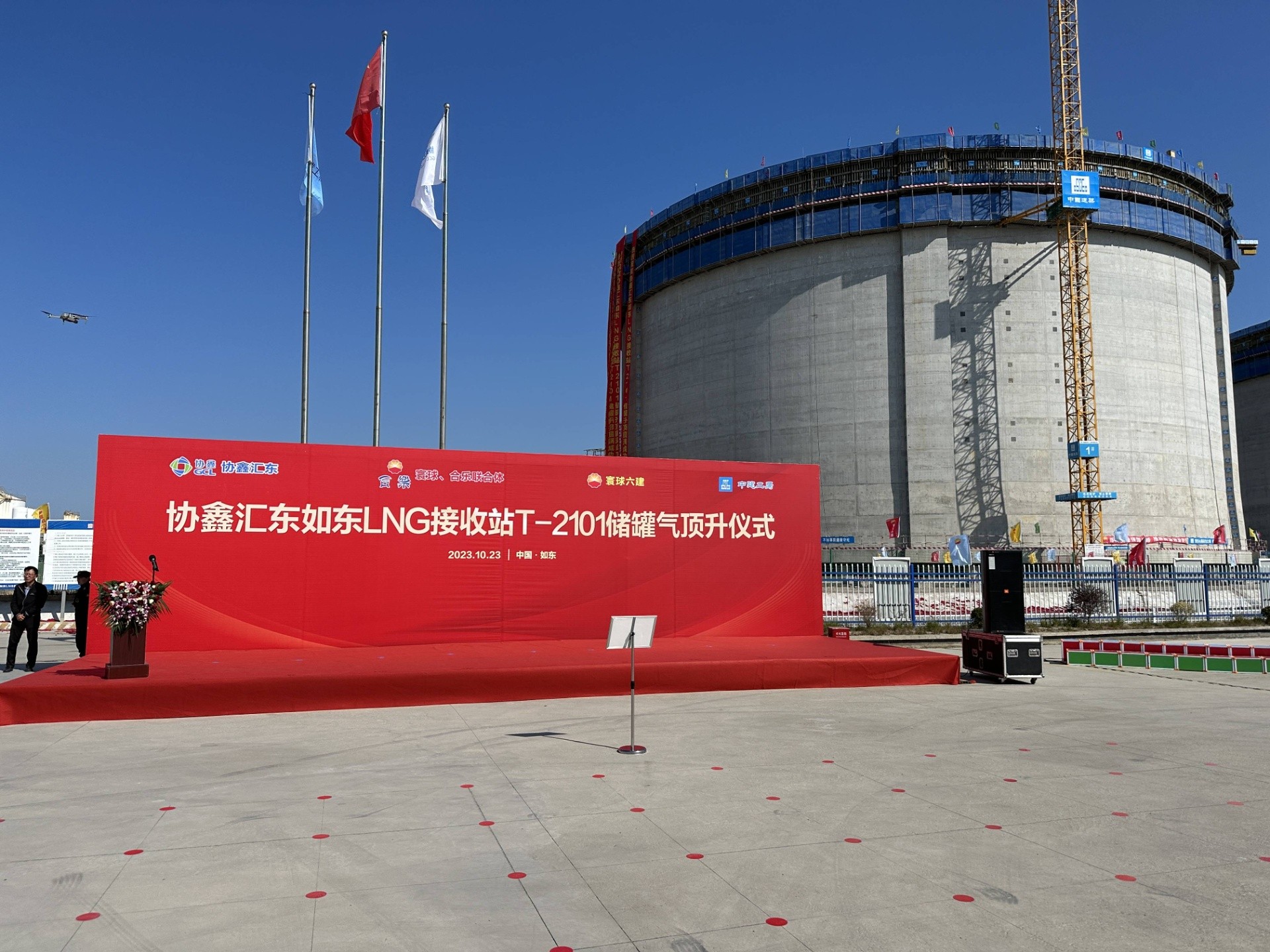 10月23日上午9點40分,如東洋口港陽光島協鑫匯東如東LNG接收站項目現場,在4臺鼓風機連續130分鐘不間斷“充氣”下,一頂由36塊鋼結構板組成、總重達900噸的“巨型鍋蓋”平穩升至45米高空,隨著拱頂板與承壓環完美對接,公司參建的T—2101號儲罐順利完成氣頂升作業,標志著國內首個集LNG接卸儲存、氣液外輸、裝船轉運等多業務、多功能于一體的LNG接收站項目由主體施工階段轉入內罐安裝階段。在此次項目中,振申絕熱承擔儲罐鋁吊頂材料供應及施工工作。