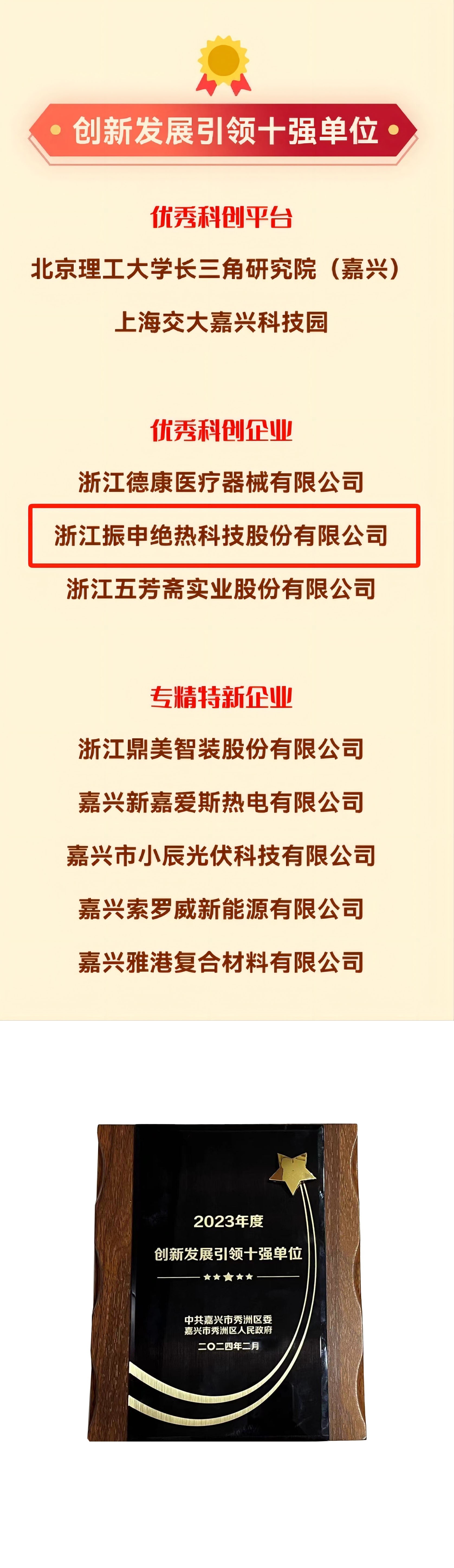 振申絕熱憑借其在絕熱保冷材料研發、生產和銷售領域的創新實力,成功躋身“2023年度創新發展引領十強單位優秀科創企業”榜單。
