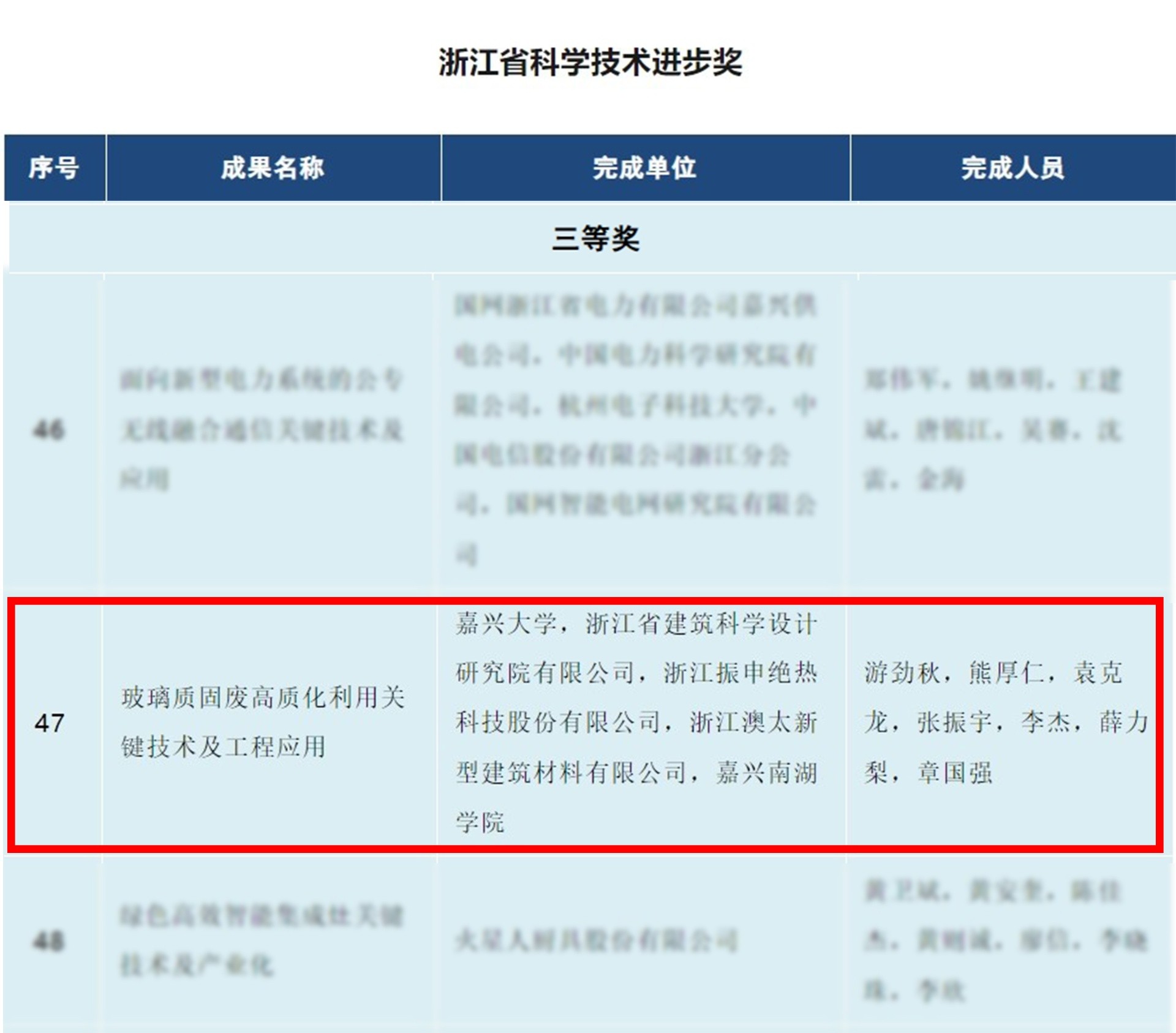 近日,加快建設(shè)創(chuàng)新浙江因地制宜發(fā)展新質(zhì)生產(chǎn)力動員部署會暨全省科學(xué)技術(shù)獎勵大會在杭州舉行,浙江振申絕熱科技股份有限公司《玻璃質(zhì)固廢高質(zhì)化利用關(guān)鍵技術(shù)及工程應(yīng)用》項目榮獲科學(xué)技術(shù)進(jìn)步獎三等獎。這是公司連續(xù)第三年獲得該獎項。